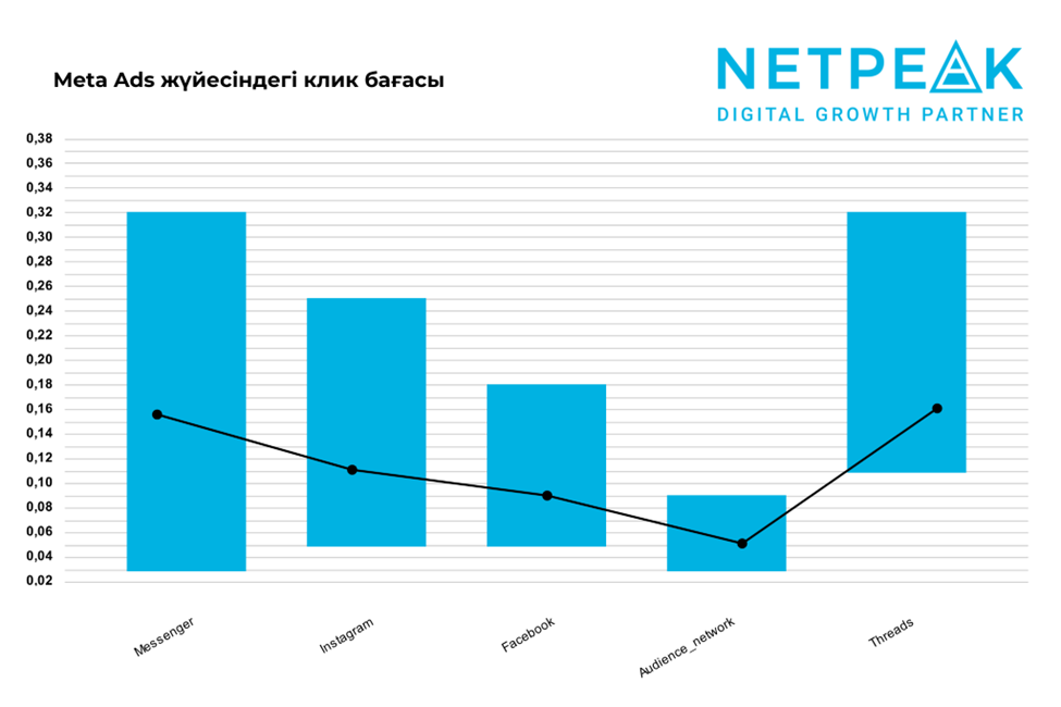 Messenger-де медианалық клик бағасы сәл төмендеді — $0,17-ден $0,16-ға дейін, ал жоғарғы квартиль $0,34-тен $0,32-ге дейін азайды. Төменгі шегі — $0,03. Instagram — Meta экожүйесіндегі жалғыз алаң, мұнда барлық диапазонда клик бағасының төмендеуі байқалды.