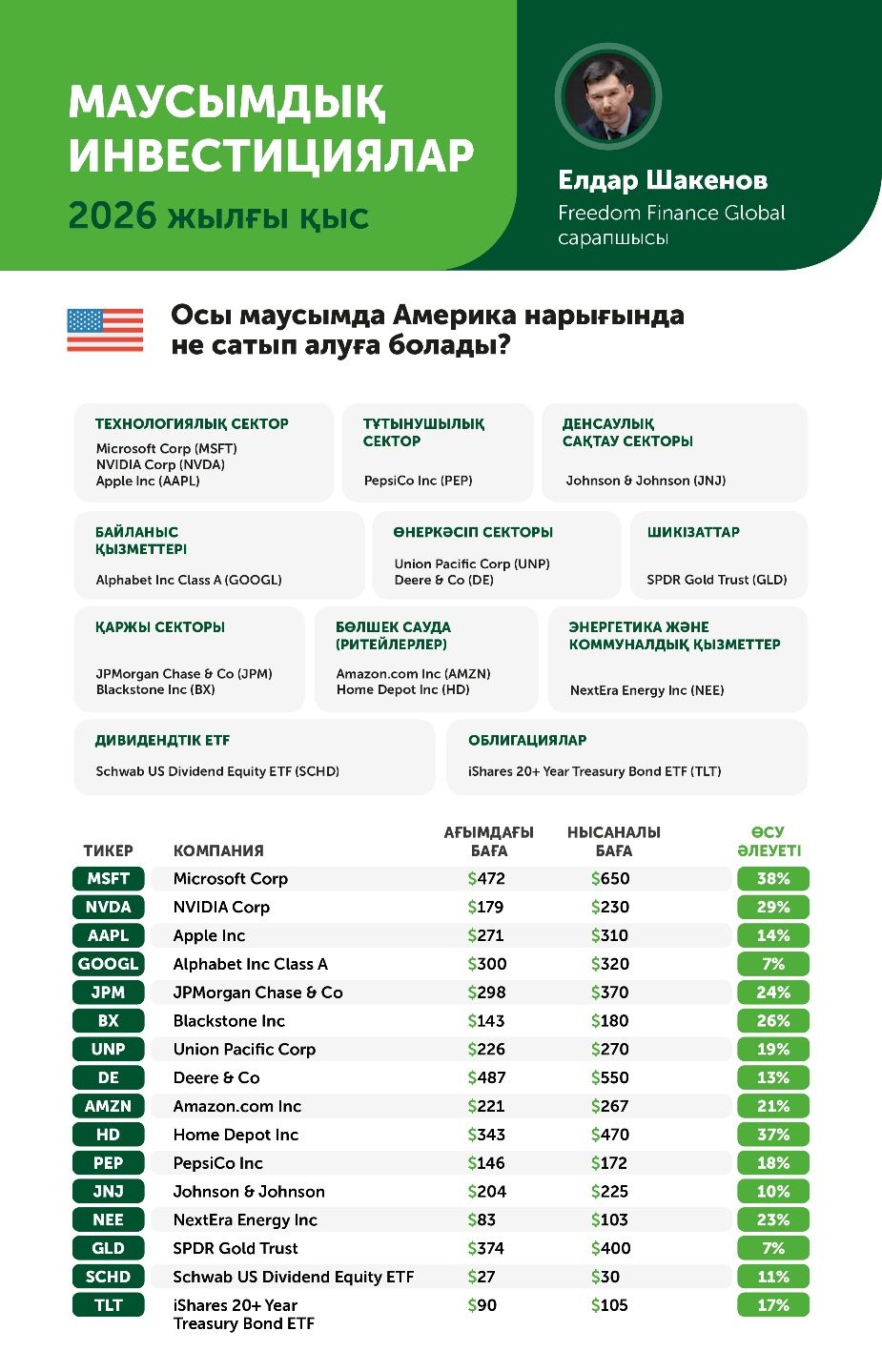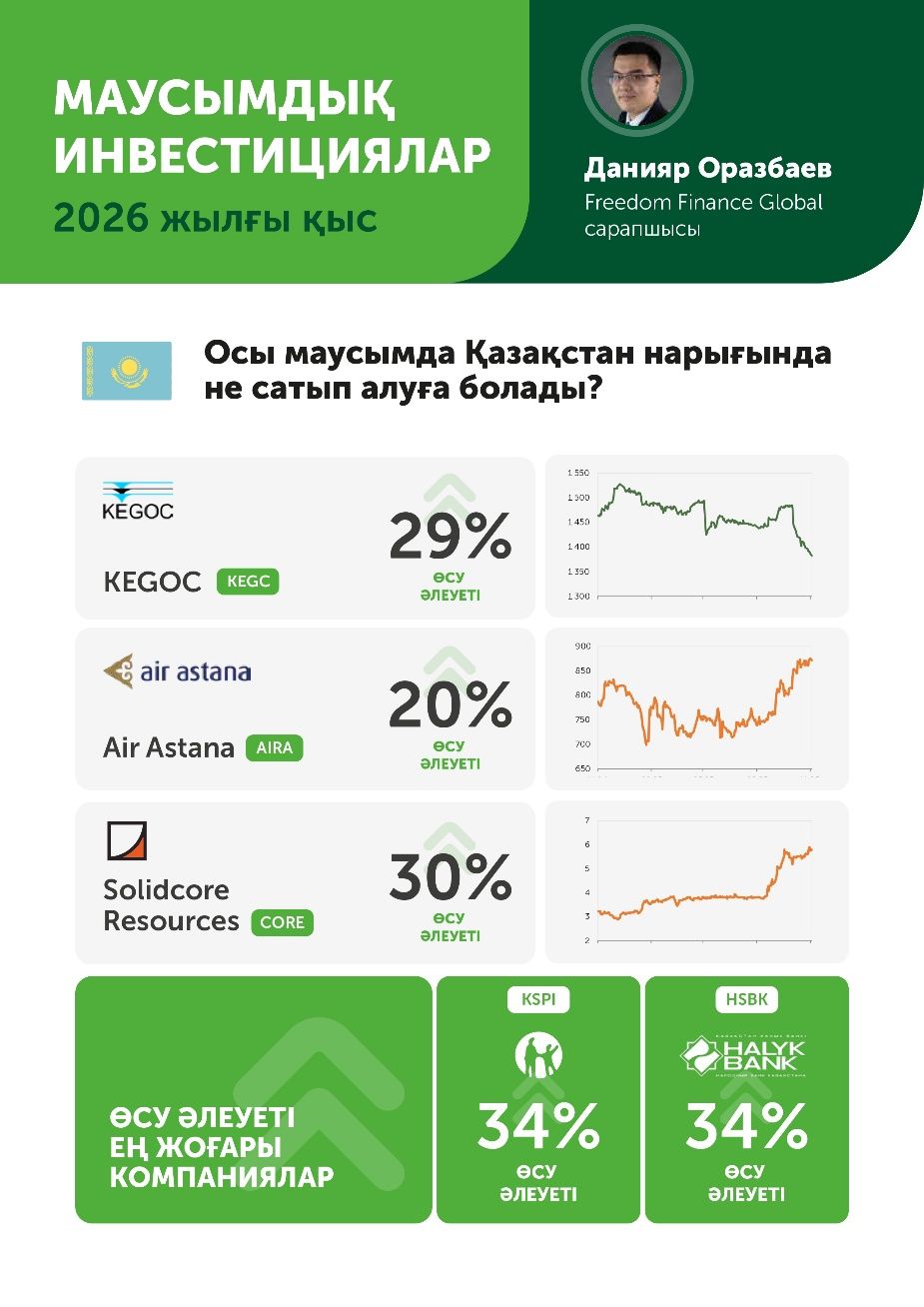Қаржы нарығындағы қысқы кезең - компаниялар жылды аяқтап, есептілікті жариялайтын, ал инвесторлар жаңа деректер негізінде бағалауды жаңартатын уақыт. Осы сәтте ақша ағыны орнықты, дивидендтік әлеуеті және болжамды серпіні бар бизнеске назар аударылады. Сонымен бірге, қысқы уақытта тұтыну мен қуат көздері шығынының өсуіне сезімтал секторларға деген қызығушылық артады. Бұл шолуда Freedom Broker-дің талдаушылары инвестициялық идеялардың таңдауын ұсынады, олар 2026 жылғы қысқы маусымда теңдестірілген портфелді құруға жарайды.