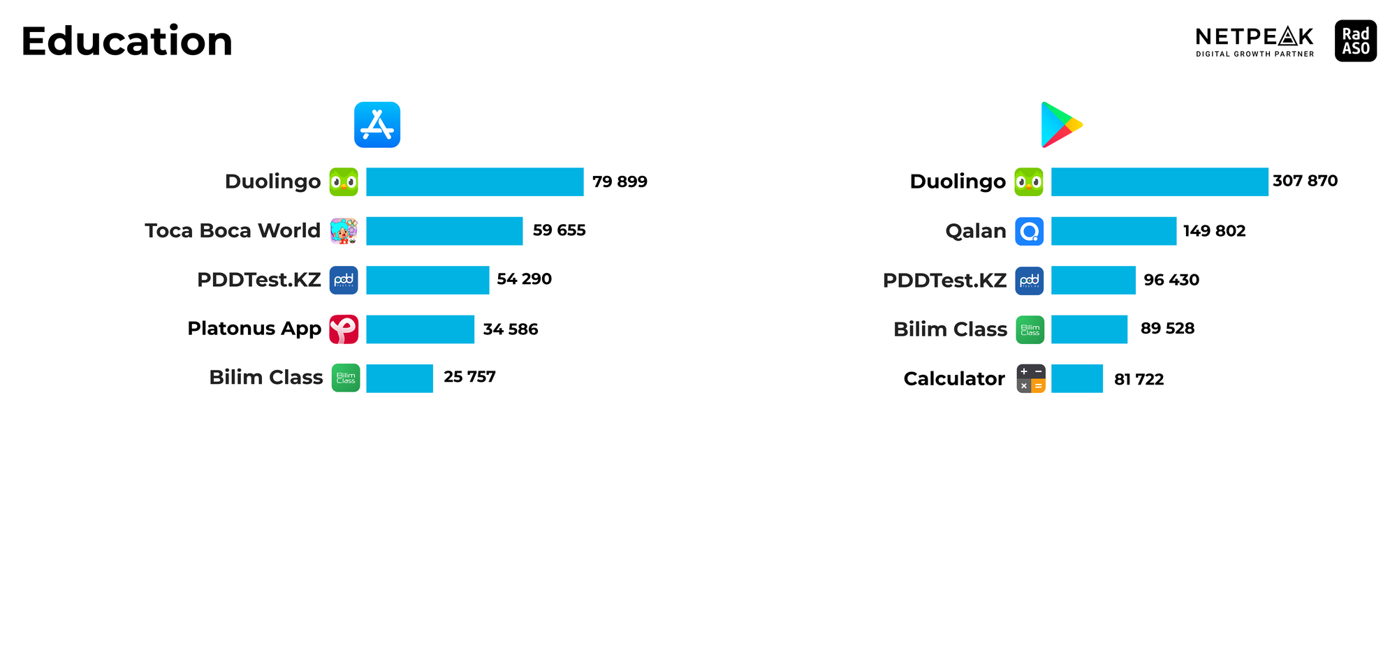 Сегмент образовательных приложений в Казахстане в III квартале 2025 года демонстрирует легкое замедление. На iOS безоговорочным лидером остаётся Duolingo — около 79,9 тыс. скачиваний за квартал (–8% к предыдущему периоду). На второй позиции — Toca BocaWorld (59,6 тыс., –2%), а PDDTest.KZ сохраняет стабильные результаты с небольшим снижением до 54,3 тыс. установок (–9%).