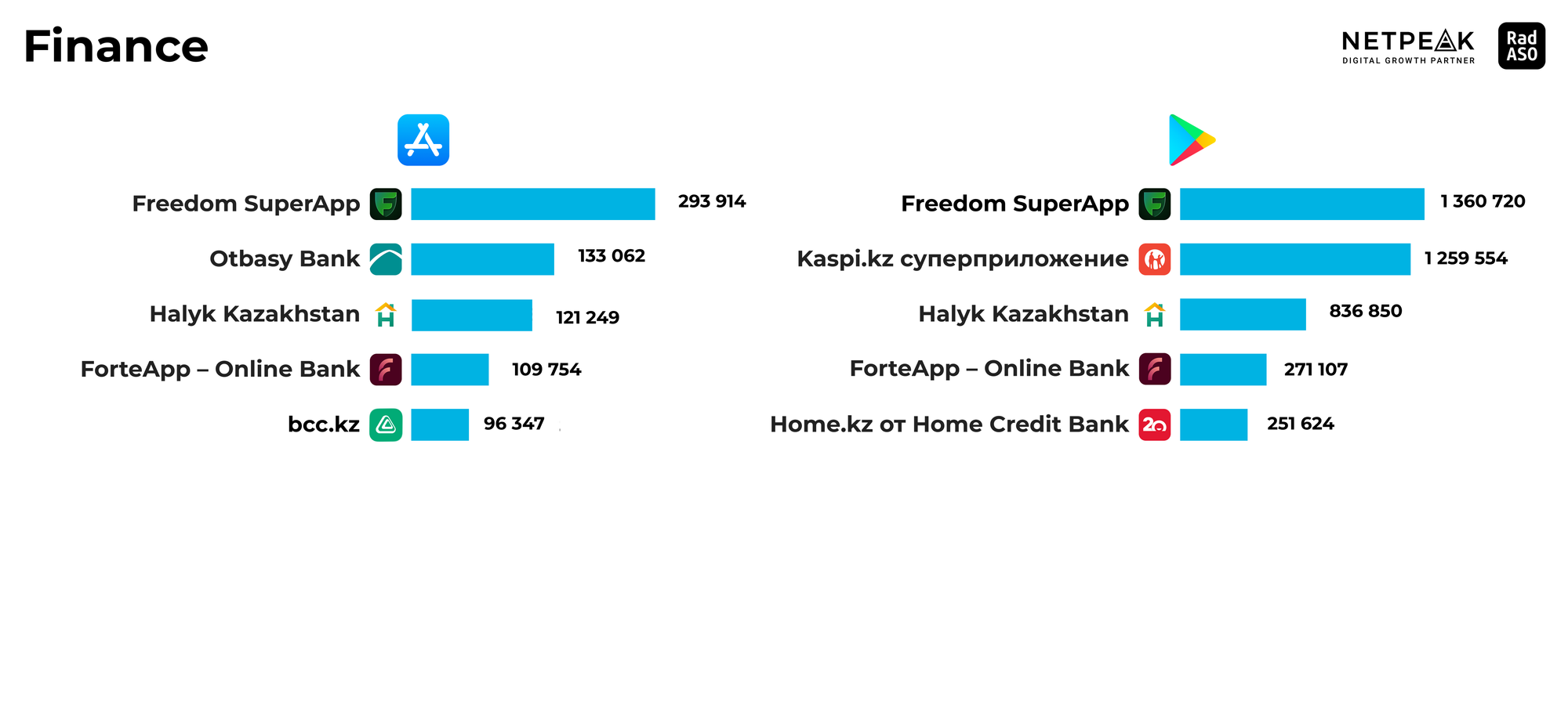 На Android-платформе ситуация развивалась динамичнее. Freedom SuperApp впервые обошёл Kaspi.kz, заняв первую строчку рейтинга с 1,36 млн скачиваний (+41%). Kaspi.kz при этом снизил показатели до 1,26 млн установок (–20%).