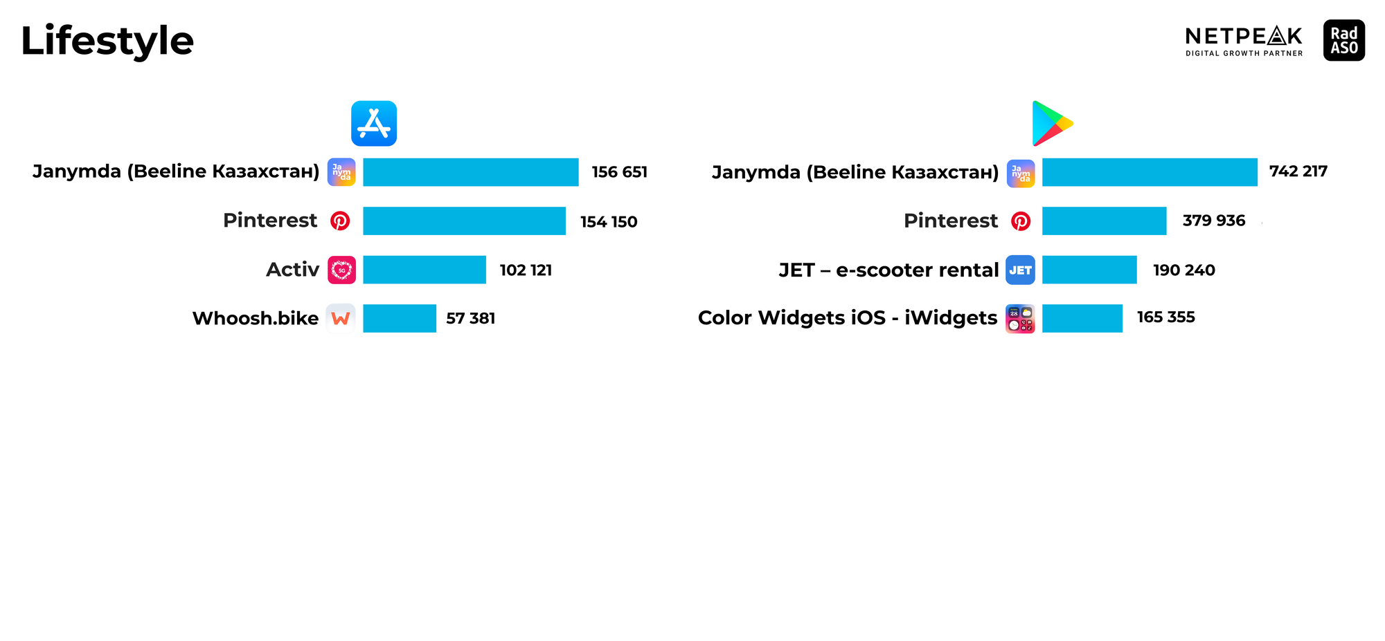 В категории Lifestyle на iOS впервые за долгое время произошла заметная перестановка. Janymda (Beeline Казахстан) вышло на первое место с 156,6 тыс. скачиваний, обогнав привычного фаворита Pinterest (154,1 тыс., –8%).