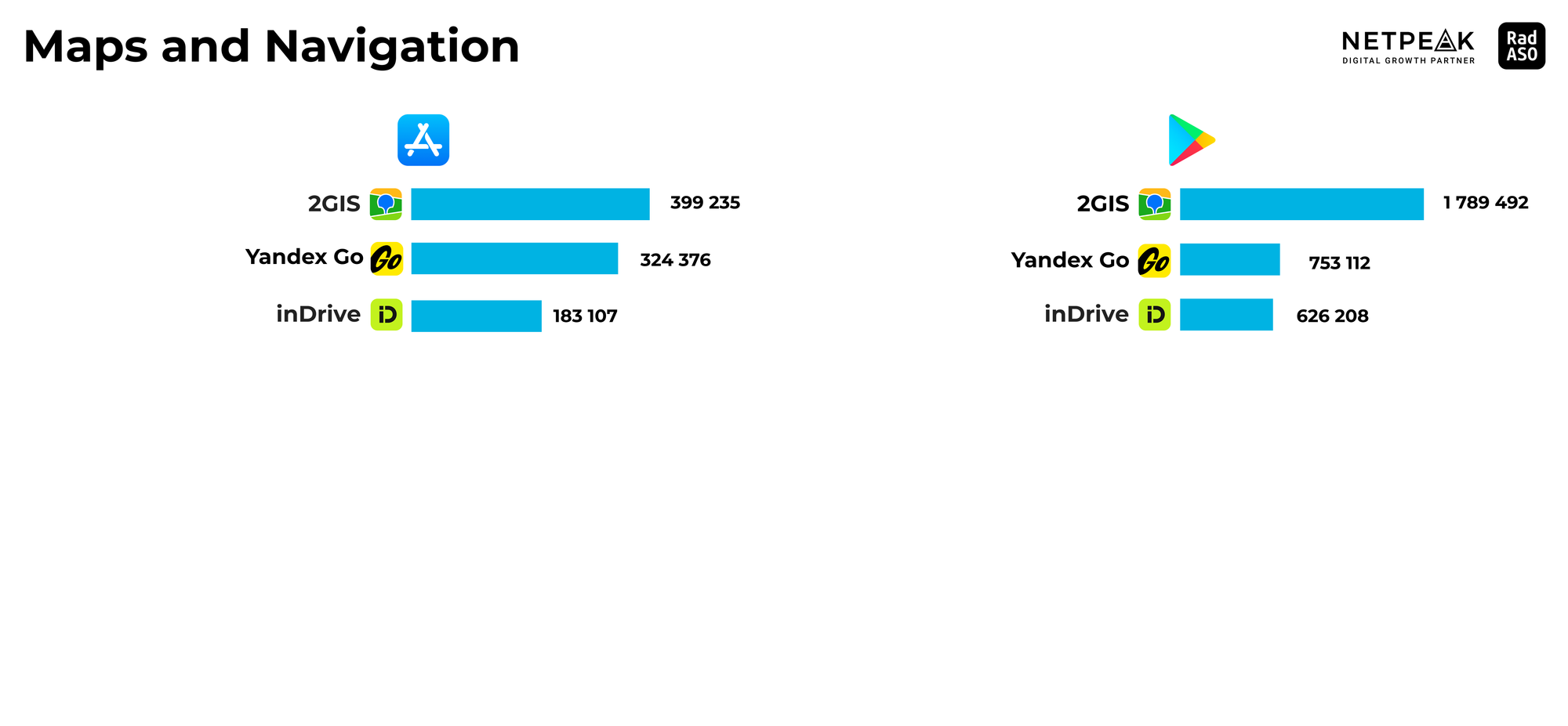 На iOS безоговорочным лидером по-прежнему является 2GIS — 399,2 тыс. скачиваний (–0,5%), оставаясь главным инструментом ориентации в городском пространстве. На втором месте оказалось приложение Yandex Go с 324,3 тыс. установок (+34%), inDriveзамыкает тройку лидеров (183,1 тыс. скачиваний).