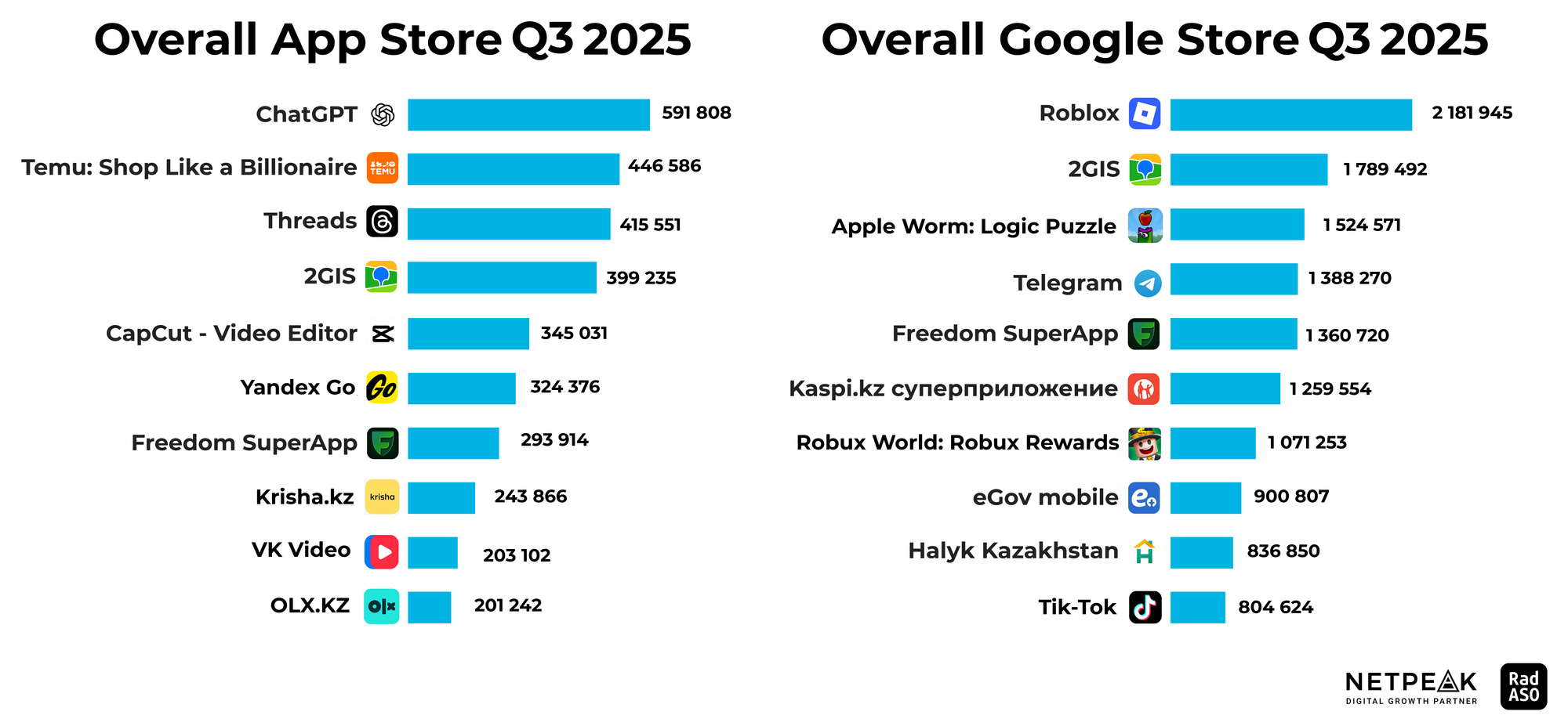 В третьем квартале 2025 года казахстанские пользователи Android снова задали темп, обеспечив более 70% всех установок. На iOSChatGPT сохраняет лидерство, однако в сентябре неожиданно уступил первое место приложению Gemini от Google.