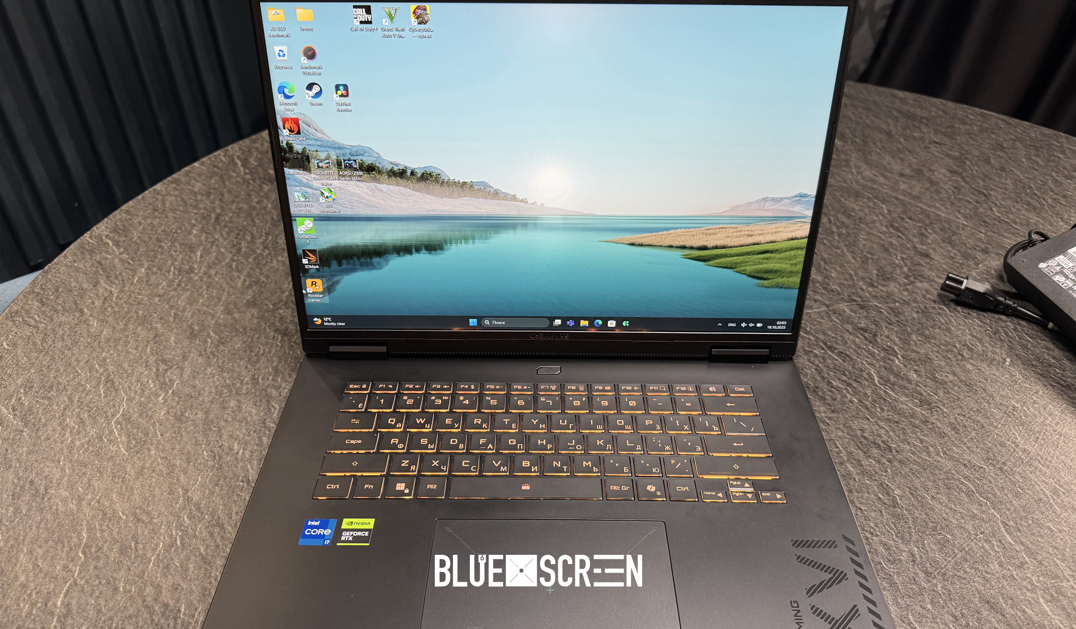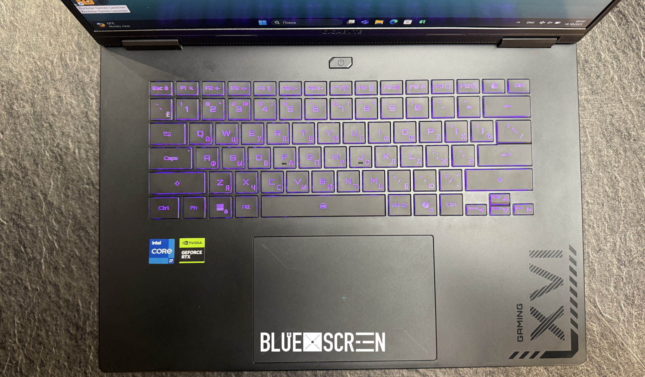 Размер корпуса 19,5–22,9 мм и ~2,2 кг, что позволяет носить его с собой. Тонкие рамки, крышка на 180°, большой тачпад, тихая клавиатура (ход до 1,7 мм). Внешне — спокойный «офисный» стиль: поставьте на переговорный стол и вопросов не будет. Низ щедро перфорирован, так что зона WASD остаётся прохладнее обычного для тонких корпусов.