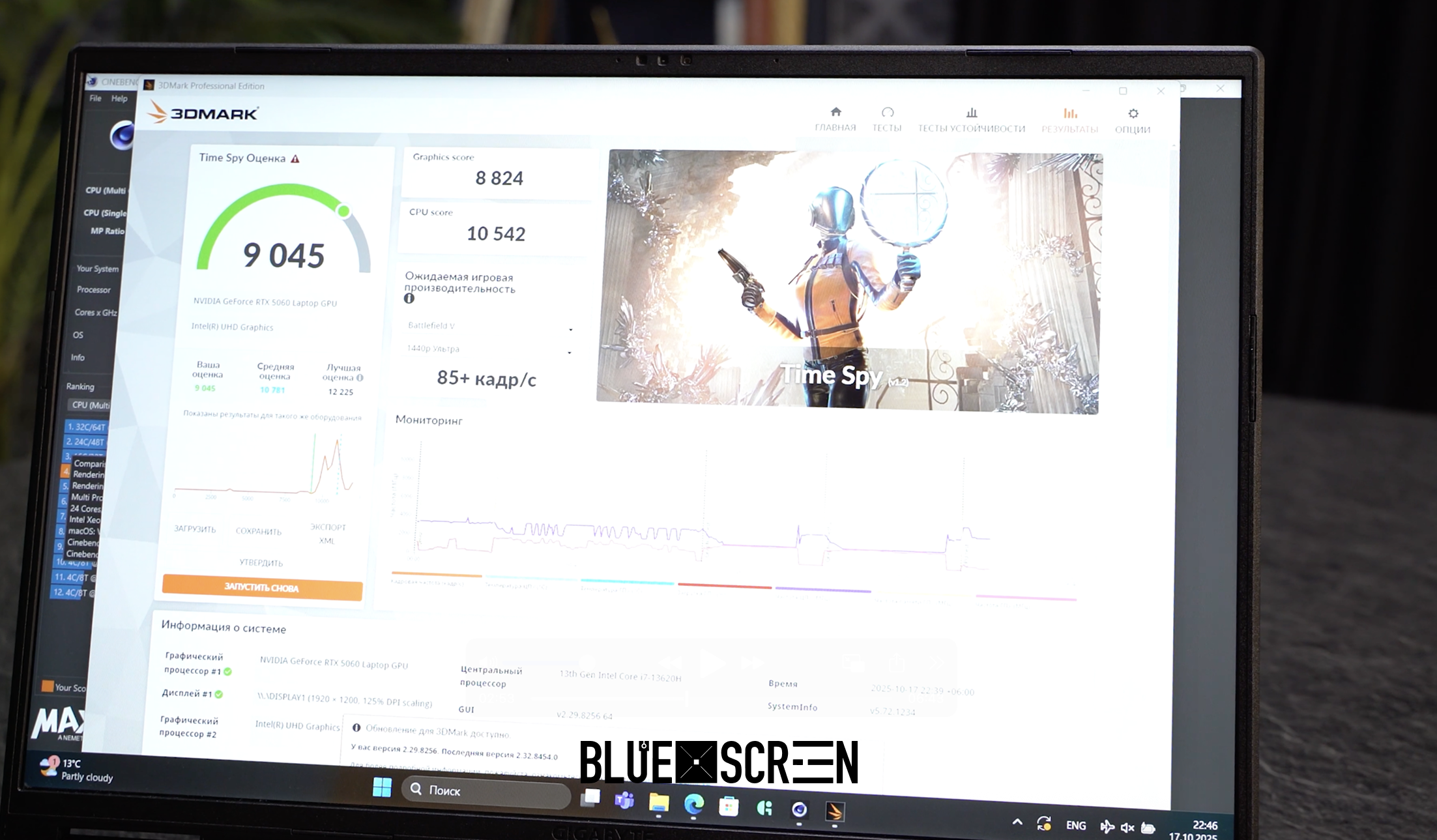 В Cinebench ноут ведёт себя предсказуемо: в R23 получаем 10 628 баллов в мультипотоке и 1 875 в одноядерном. Для тонкого 16-дюймового корпуса это именно то, чего ждёшь от i7-13620H: стабильность без сюрпризов. В 3DMark картина похожая: Time Spy (DX12) по графике 8 824, по CPU 10 542. Steel Nomad выдает 1 946 баллов, а Speedometr 3.0 34.4. Эти цифры хорошо коррелируют с тем, что мы видим дальше в играх.