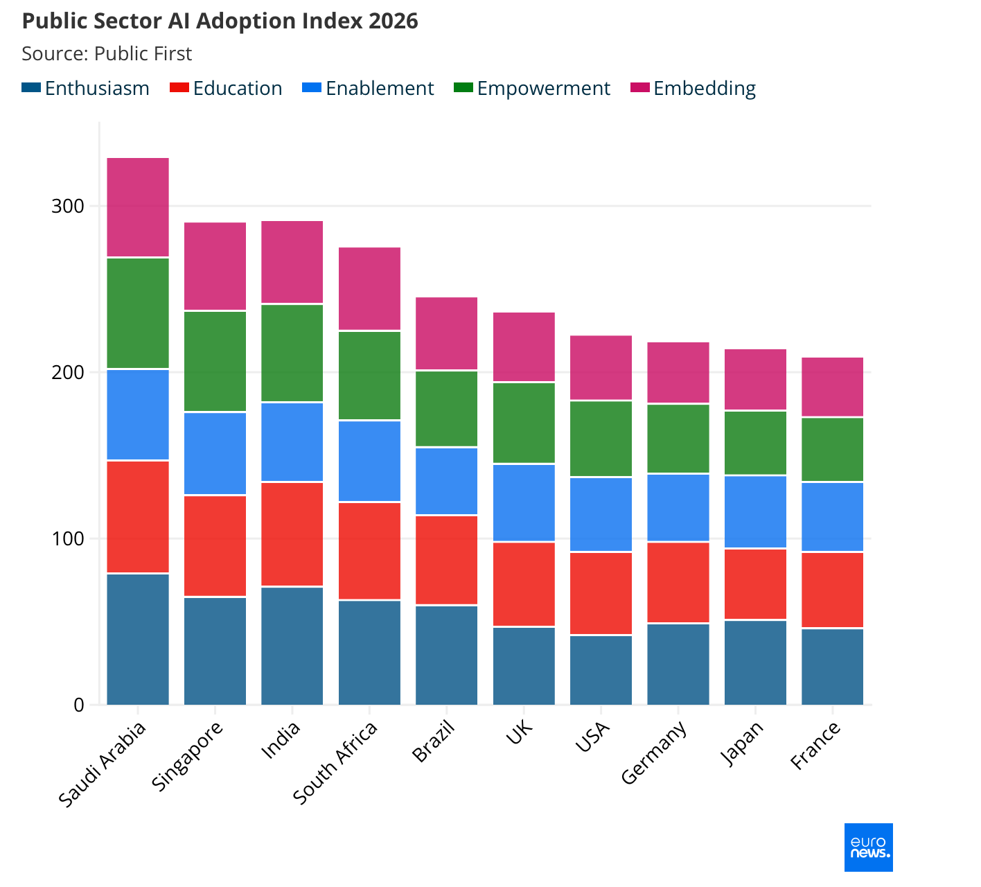 Франция заняла последнее место в новом глобальном рейтинге внедрения искусственного интеллекта в государственном секторе. Согласно Индексу внедрения ИИ в госсекторе 2026 (Public Sector AI Adoption Index 2026), почти половина французских госслужащих никогда не использовали ИИ в работе, несмотря на масштабные инвестиции страны в цифровую инфраструктуру.