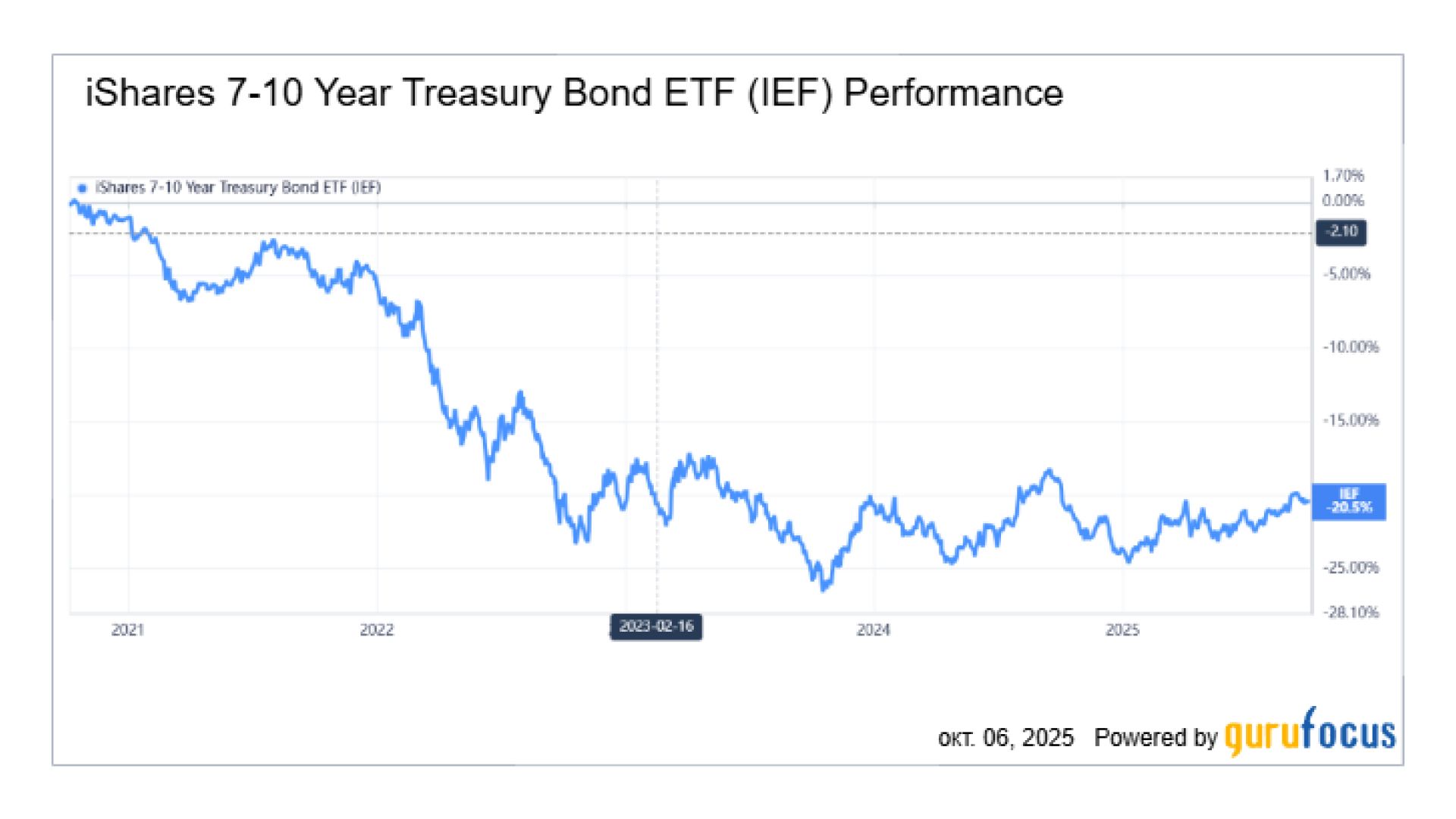 Динамика ETF IEF (7–10-летние казначейские облигации США) за последние 5 лет. Источник – gurufocus.com