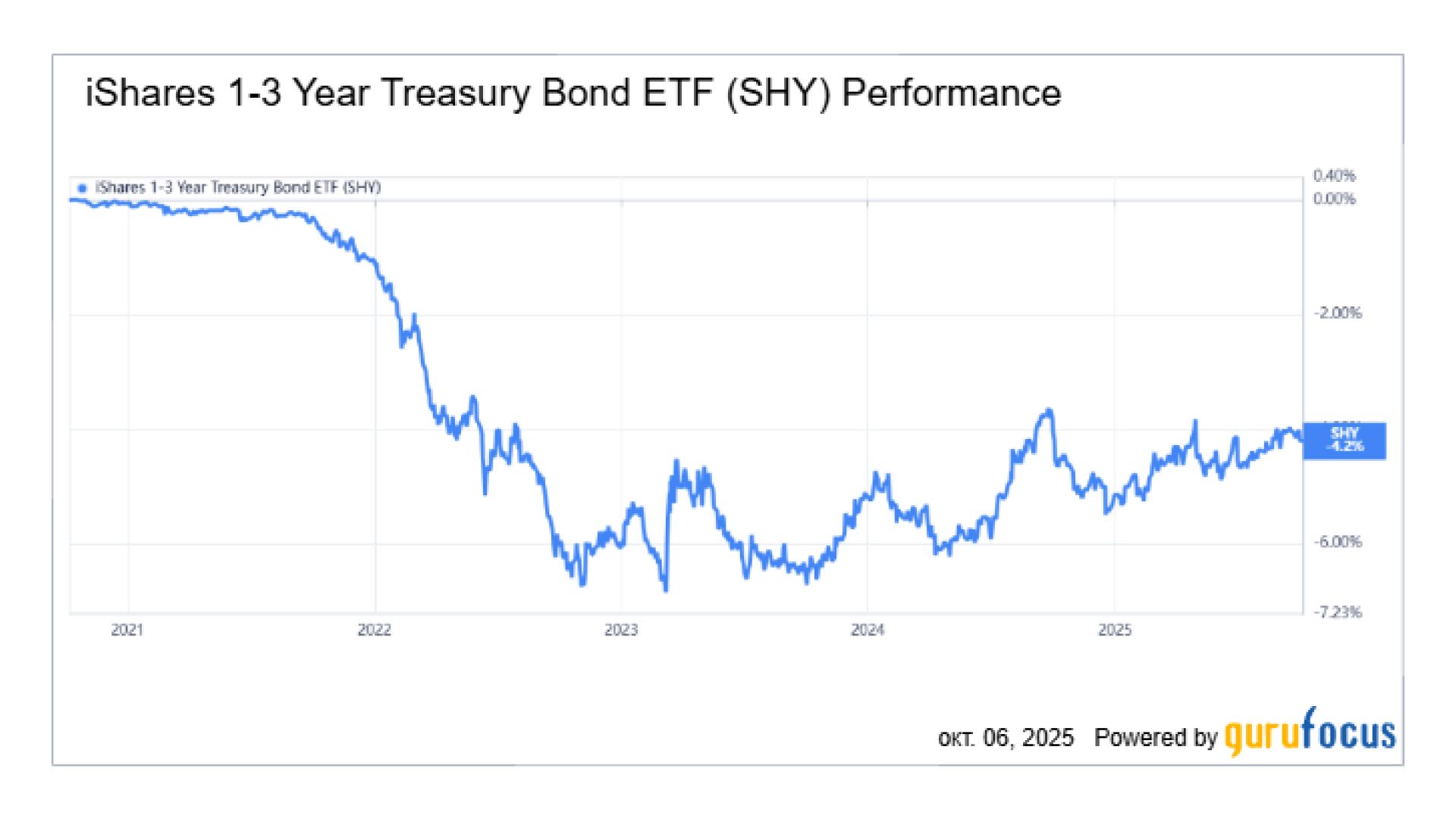 Динамика ETF SHY (1–3-летние казначейские облигации США) за последние 5 лет. Источник – gurufocus.com