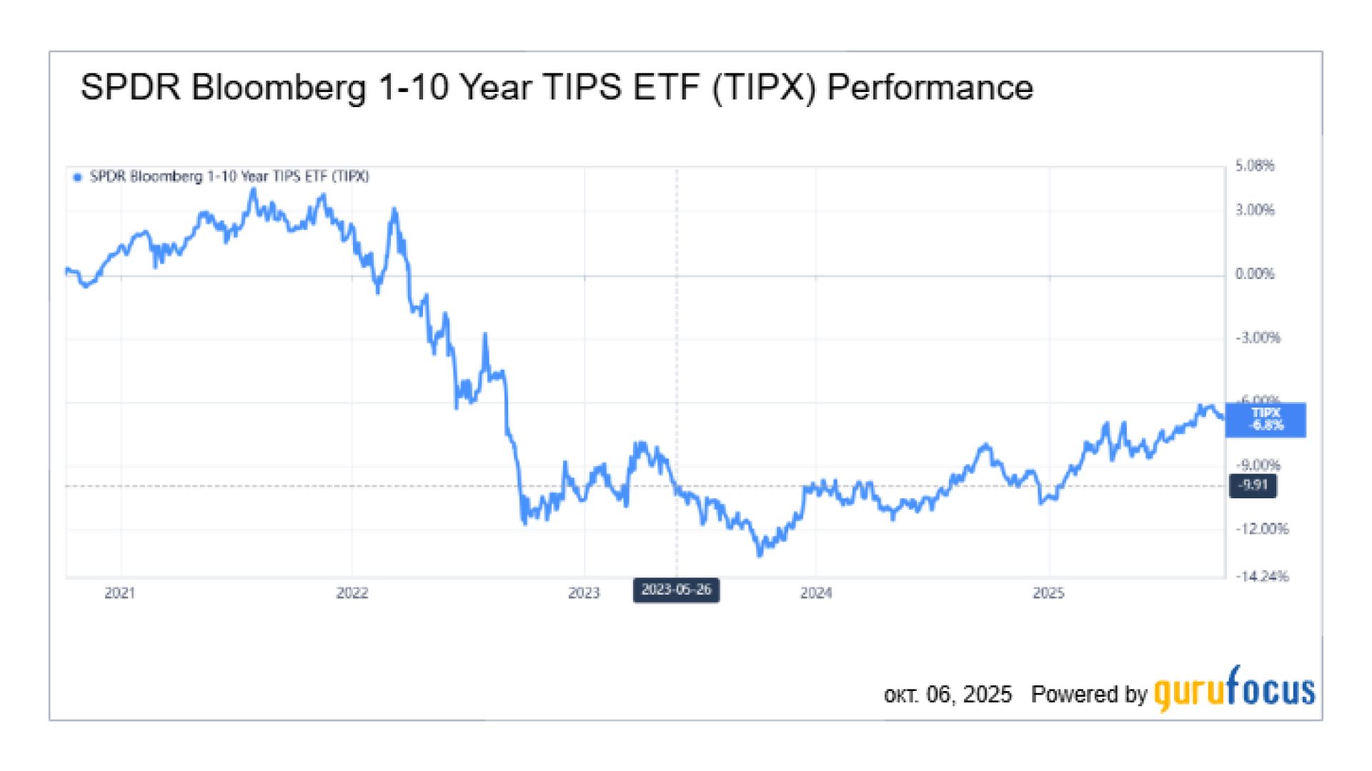 Динамика ETF TIPX (1–10-летние казначейские облигации США с защитой от инфляции) за последние 5 лет. Источник – gurufocus.com