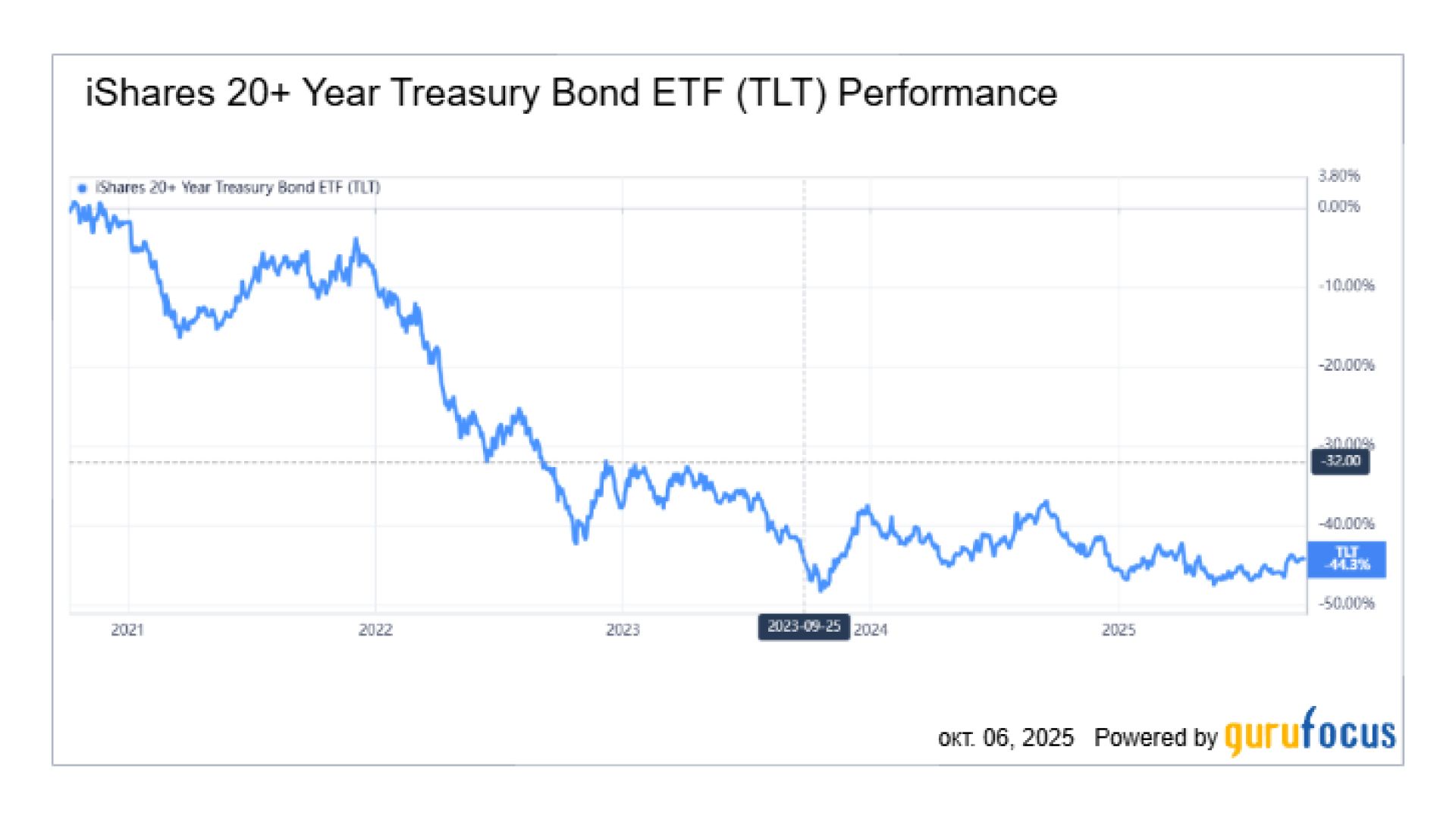 Динамика ETF TLT (20-летние казначейские облигации США) за последние 5 лет. Источник – gurufocus.com