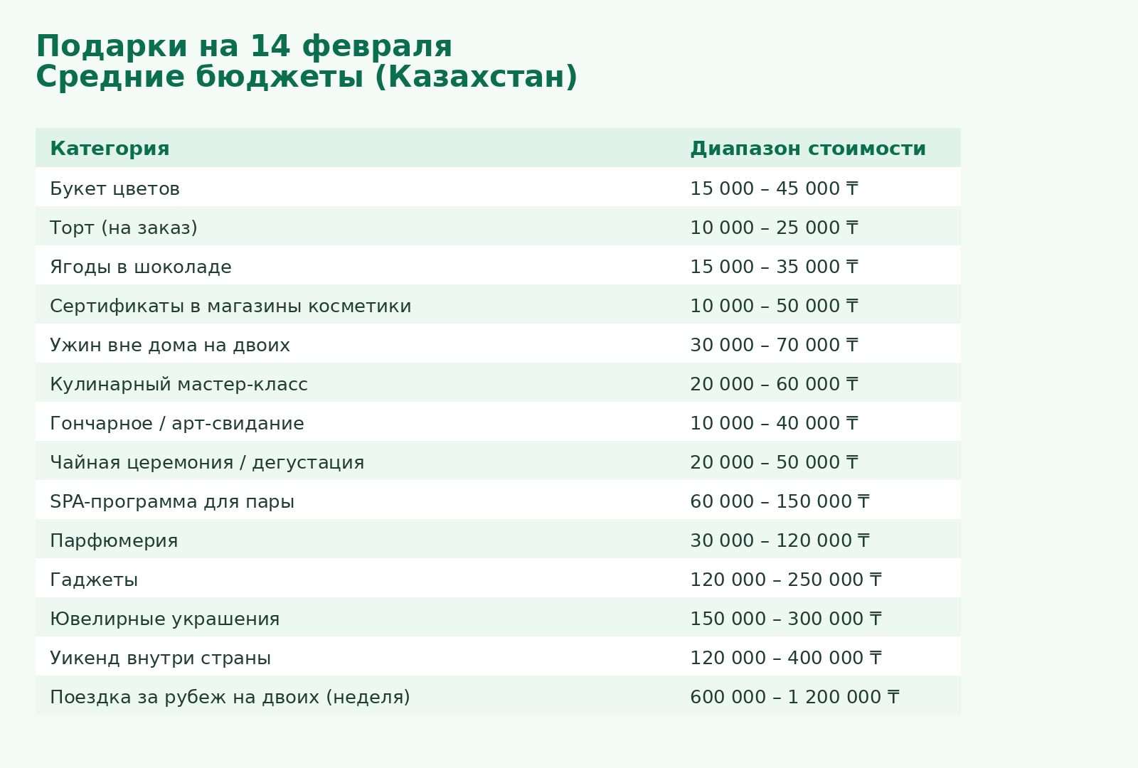 Даже базовые подарки формируют вполне ощутимый бюджет. Символические жесты — цветы, сладости, подарочные сертификаты, кулинарный мастер класс, гончарное/арт свидание, чайная церемония и ужин на двоих — чаще всего укладываются в диапазон до 50 тыс. тенге, тогда как кратковременные поездки внутри страны парфюмерия, гаджеты, ювелирные украшения — переходят в категорию серьезных трат, сопоставимых с месячным бюджетом семьи. Международное путешествие на двоих становится самым дорогим форматом подарка: недельная поездка в популярные направления, такие как Турция, Таиланд, Вьетнам или ОАЭ, оценивается примерно в 600 тыс. – 1,2 млн тенге.