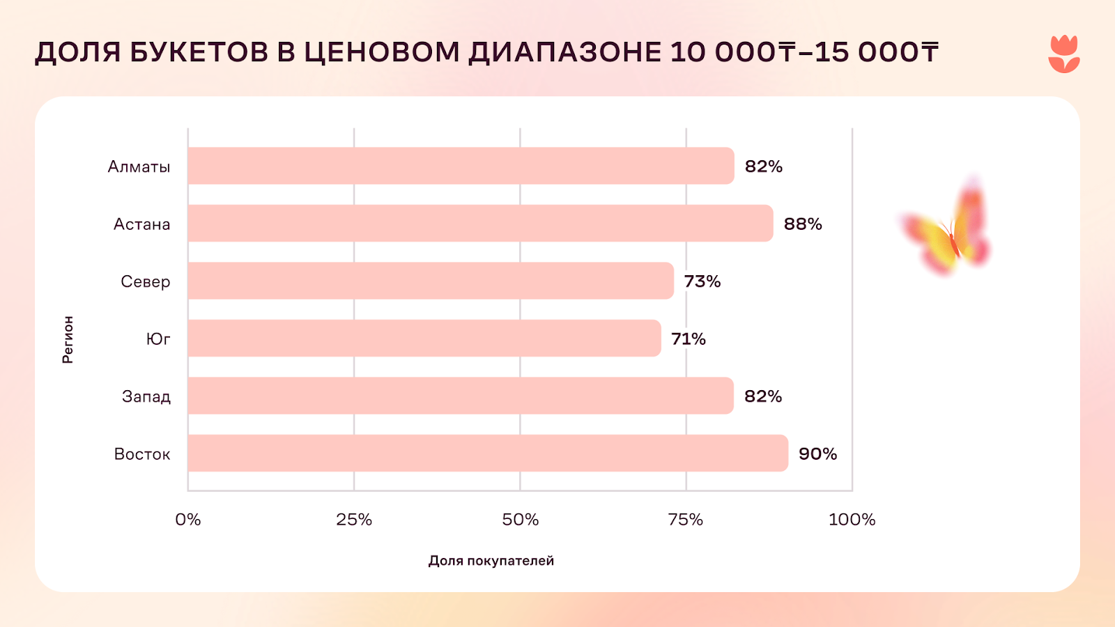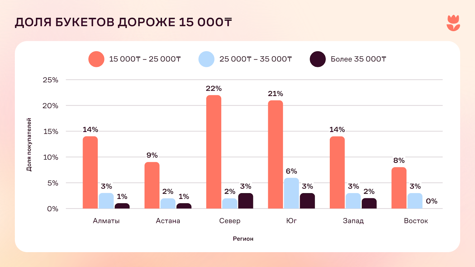 Потратить на цветы более 25 000 тенге готовы лишь 3% казахстанцев, а более 35 000 тенге — 1–2% в зависимости от региона.