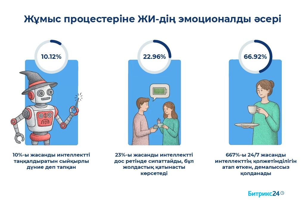 Битрикс24 жасанды интеллекттің (ЖИ) жұмыс үдерістеріне ықпалын зерттеуді жалғастыруда. Жақында әлем бойынша 2200-ден астам клиент пен портал қатысқан зерттеу қызықты қорытындыларды көрсетті. Пайдаланушылардың едәуір бөлігі ЖИ-ді тек сенімді көмекші ретінде ғана емес, сонымен қатар жағымды эмоция сыйлайтын құрал ретінде қабылдайды. Ол жұмысқа қуаныш қосып, күйзеліс деңгейін төмендетеді.