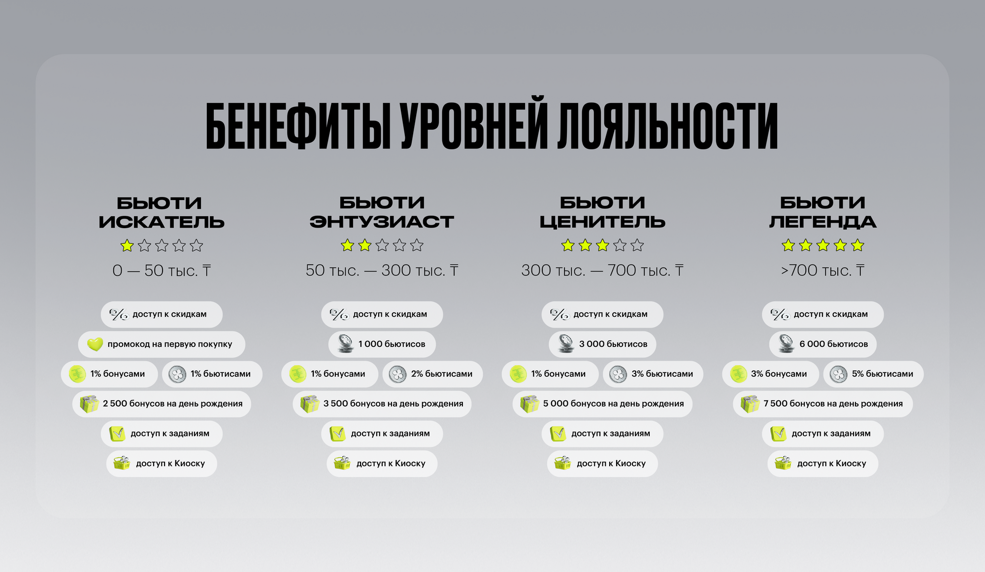 - Бьюти-легенда — высший уровень программы лояльности, который присваивается при достижении порога покупок в 700 000 тенге. Бьюти-легенды за покупки будут получать 3% бонусами и 5% бьютисами.