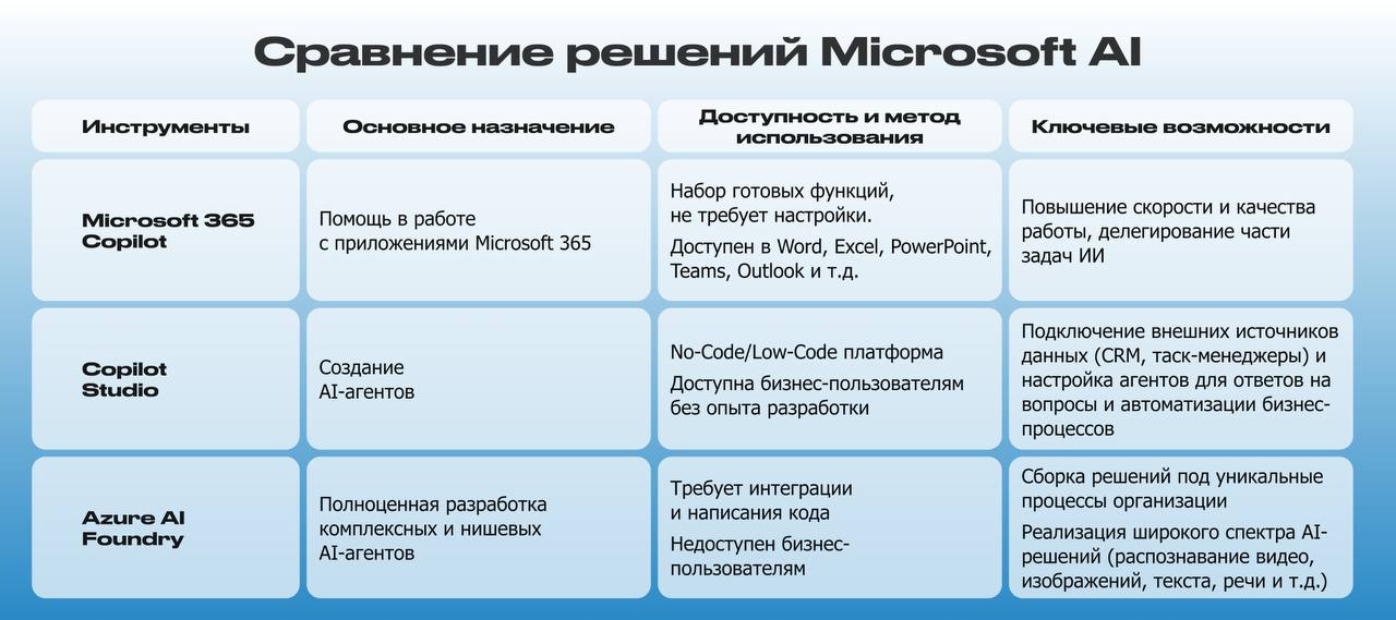 Это уже инструмент для создания AI-решений, и, прежде всего, AI-агентов. Здесь не нужно писать код, это так называемая no-code или low-code платформа, которая позволяет и источники данных подключать из внешних систем: свою CRM-систему, таск-менеджер или проектную систему, и настроить агентов, которые будут отвечать на вопросы, используя информацию из этих систем. Может помогать автоматизировать определенные бизнес-процессы, или запускать согласования внутри этих систем. Copilot Studio такой инструмент, который позволяет это делать в специальном редакторе, в котором может работать даже бизнес-пользователь без какого-либо опыта в разработке.