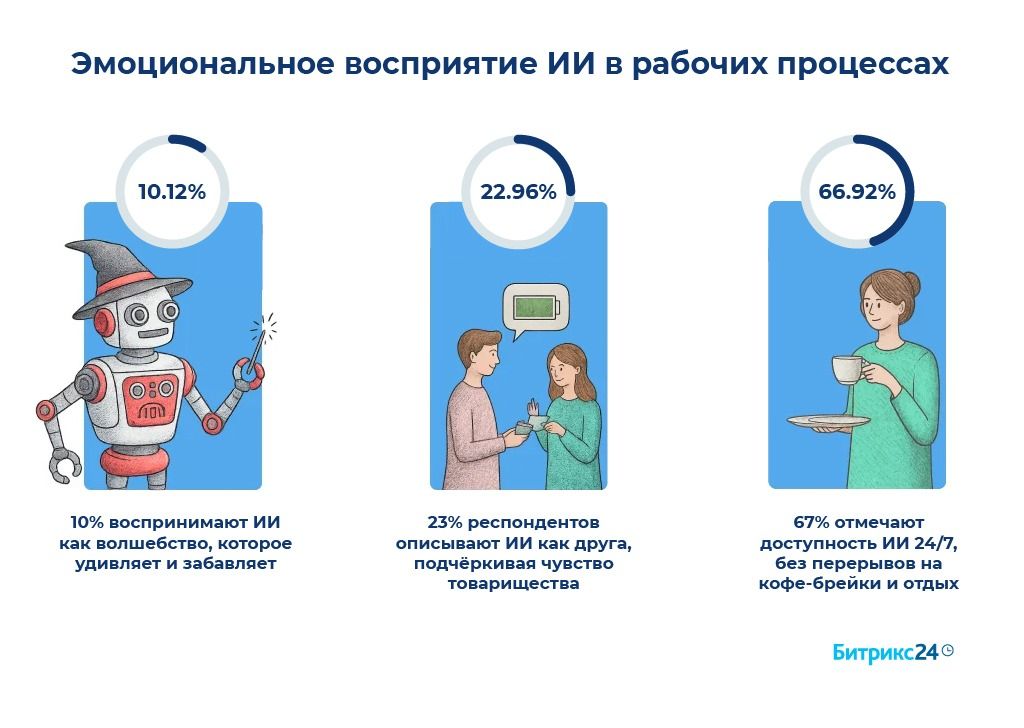 Битрикс24 продолжает изучать влияние искусственного интеллекта на рабочие процессы. И недавние исследования, в которых поучаствовали более 2200 клиентов/порталов по всему миру, привели к интересным выводам. Ощутимая часть пользователей воспринимает ИИ не просто, как надежного помощника, а формируют эмоциональную связь, которая приносит радость и снижает уровень стресса