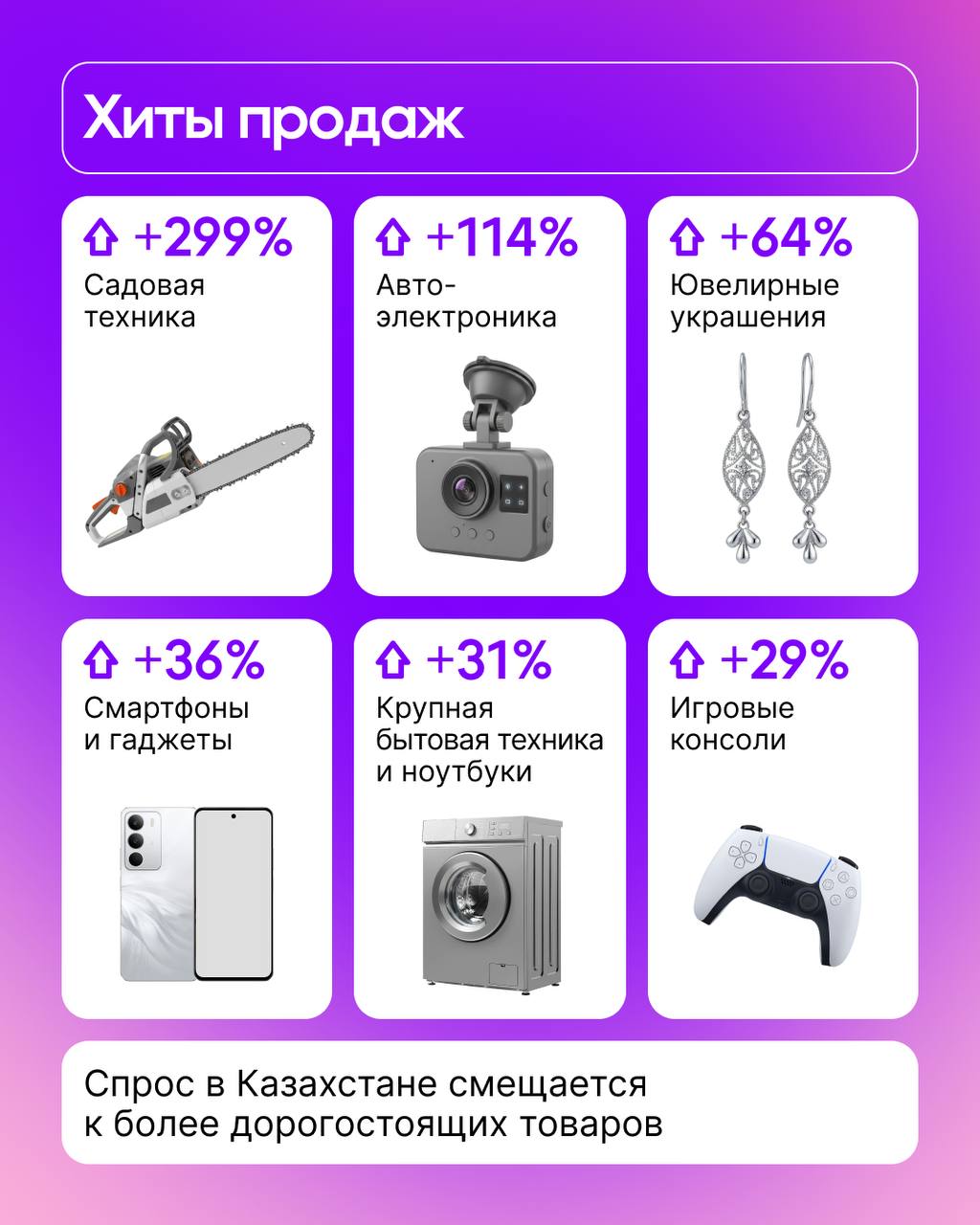 Наибольшую динамику роста по всей стране показывают категории: садовая техника (+299% в денежном выражении год к году), автоэлектроника (+114%), ювелирные украшения (64%), смартфоны и гаджеты (+36%), крупная бытовая техника и ноутбуки (+31%), игровые консоли(+29%).