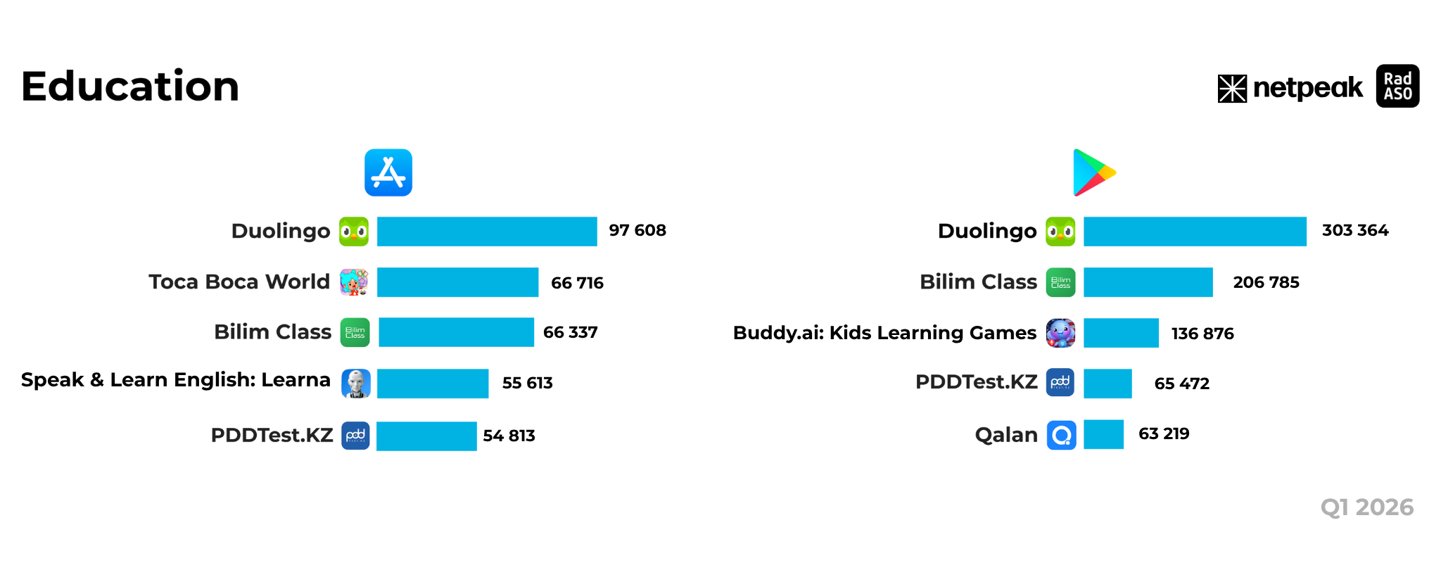 Bilim Class за первый квартал 2026 года показал результат в 206,7 тыс. установок. В сравнении с первым кварталом 2025 года (179,8 тыс.) охват сервиса вырос на 15%, что подтверждает, что многие школы стали переходить на данную платформу. Математический тренажер Qalan сократил объем новых инсталлов до 63,2 тыс., что почти вдвое меньше его показателей в начале прошлого года (120,6 тыс.). Buddy.ai увеличил количество скачиваний до 136,8 тыс. против 108,5 тыс.