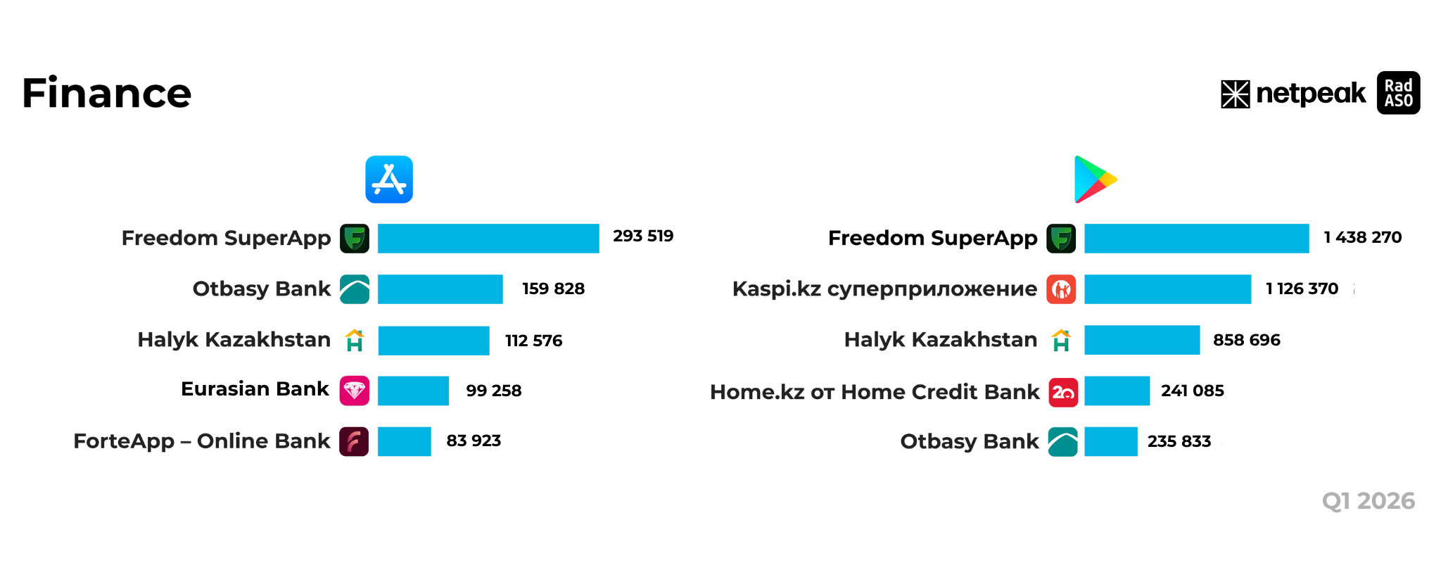 Заметная динамика зафиксирована у Halyk Kazakhstan, который в первом квартале 2026 года показал результат в 112,5 тыс. инсталлов, что на 20% выше показателей годичной давности (93,8 тыс.). При этом ForteApp, совершивший рывок в конце 2025 года, в начале 2026-го отошел на пятую позицию (83,9 тыс.), пропустив вперед Eurasian Bank (99,2 тыс.), который ворвался в четверку лидеров.
