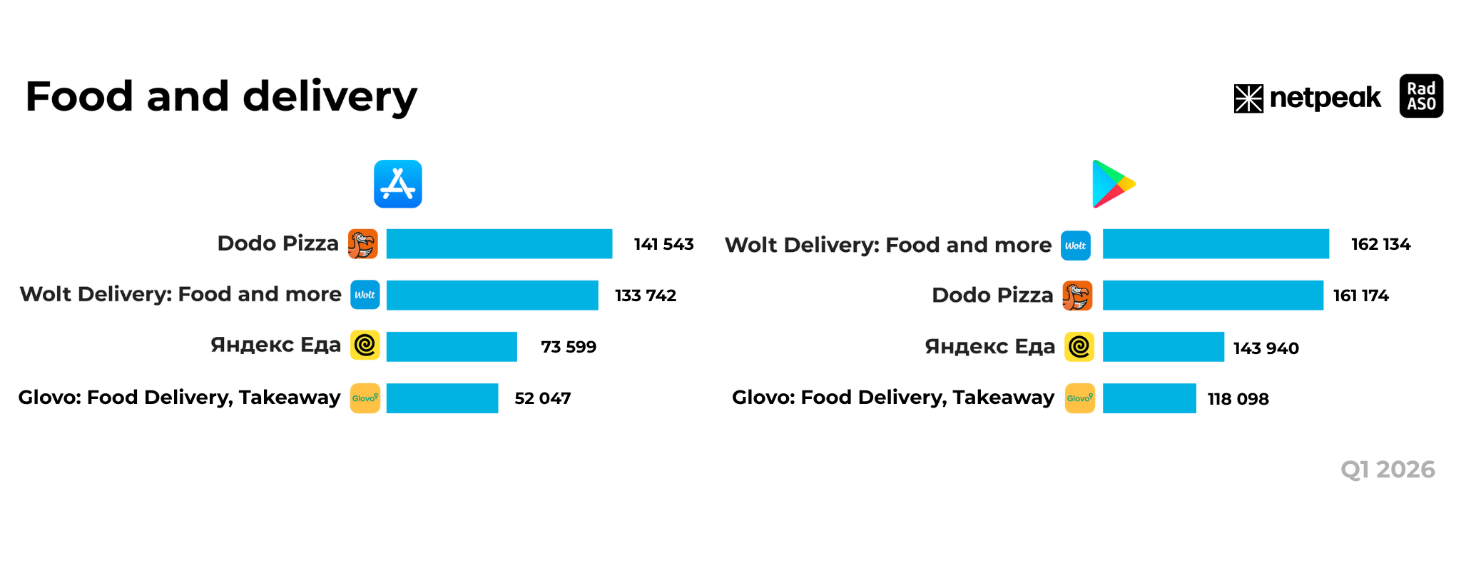 На платформе Android Wolt вернул себе первое место с результатом 162,1 тыс. установок, минимально обойдя Dodo Pizza (161,1 тыс.). Годовое сравнение показывает, что оба сервиса вышли на плато, сохраняя цифры на уровне начала 2025 года.