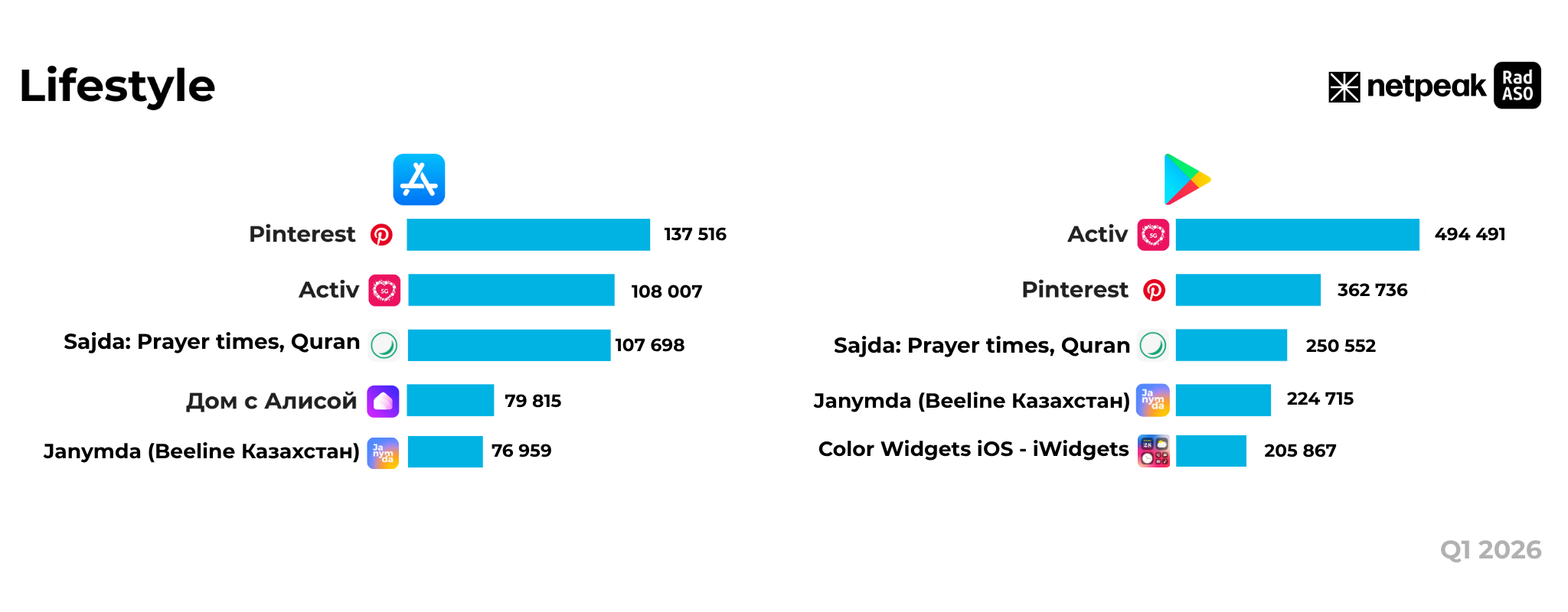 На устройствах Apple Pinterest сохраняет лидерство, хотя объем новых скачиваний (137,5 тыс.) заметно снизился по сравнению с четвертым кварталом 2025 года (166,9 тыс.) и аналогичным периодом прошлого года (154,5 тыс.). Вторую строчку занял сервис activ (108 тыс.), который в годовом исчислении вырос более чем на 30% (с 82,8 тыс.). Вплотную к нему идет Sajda (107,6 тыс.) — религиозное приложение традиционно демонстрирует рост в первом квартале. Замыкают топ-5 «Дом с Алисой» (79,8 тыс.) и Janymda от Beeline (76,9 тыс.), которая потеряла позиции лидера конца прошлого года, но остается в числе наиболее востребованных сервисов для повседневной жизни.