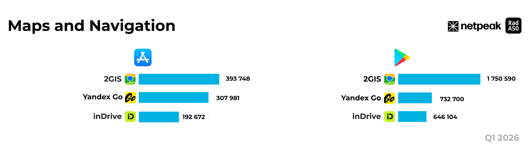 В экосистеме Apple 2GIS с результатом 393,7 тыс. установок приложение практически идентично повторяет показатели как четвертого квартала 2025-го, так и начала прошлого года.