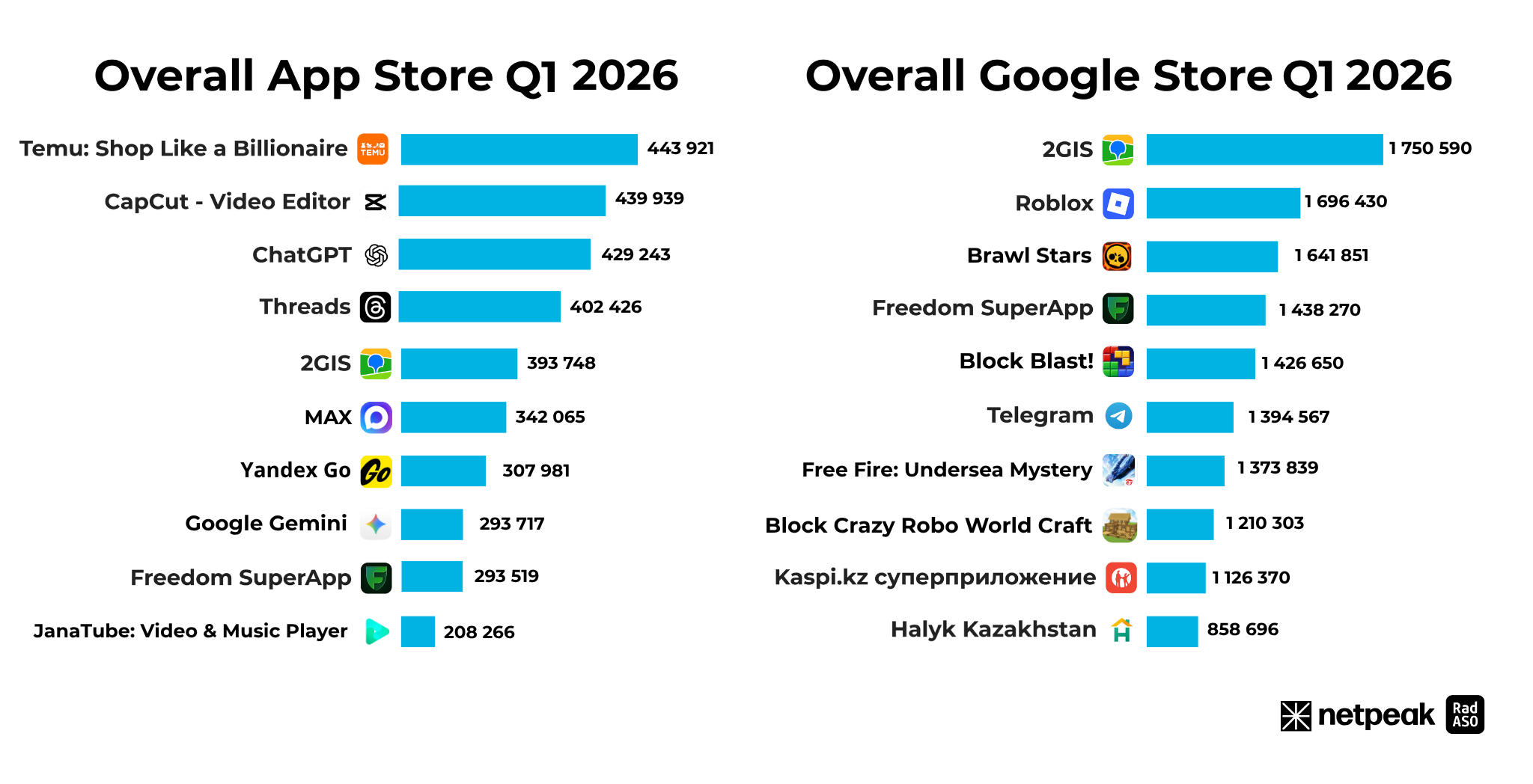 На платформе Android основной драйвер — развлечения и банковские сервисы. После падения в конце года Roblox начал восстанавливать позиции (1,69 млн), однако так и не смог сместить с первого места 2GIS (1,75 млн), который остается самым стабильным приложением по количеству скачиваний в стране. В игровом секторе фиксируется взлет Brawl Stars (1,64 млн), в то время как прошлогодний лидер Block Blast! потерял почти половину аудитории по сравнению с Q1 2025. В сегменте финтеха Freedom SuperApp — 1,43 млн установок против 1,21 млн годом ранее.