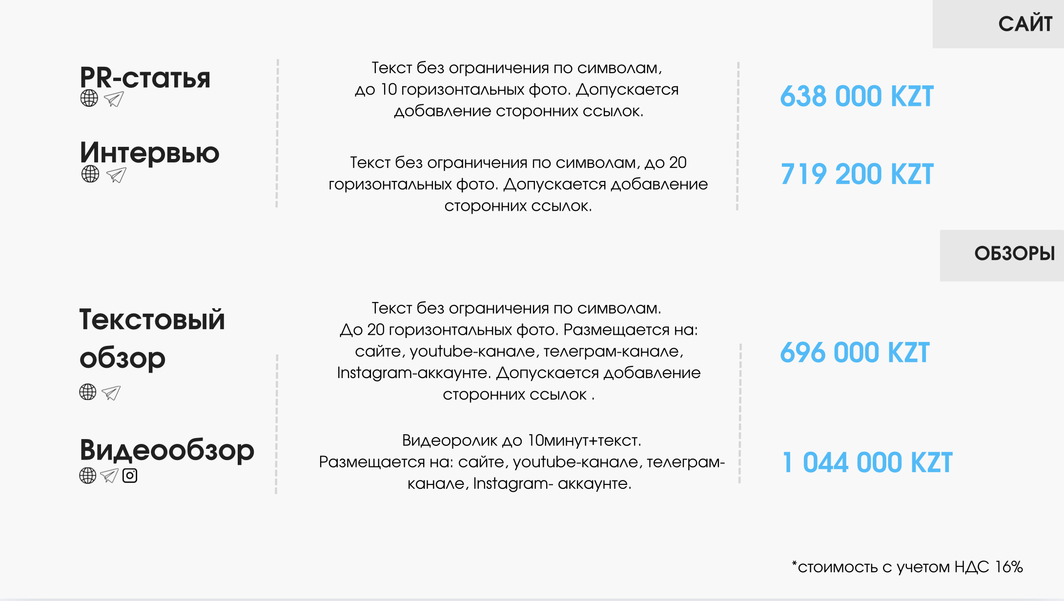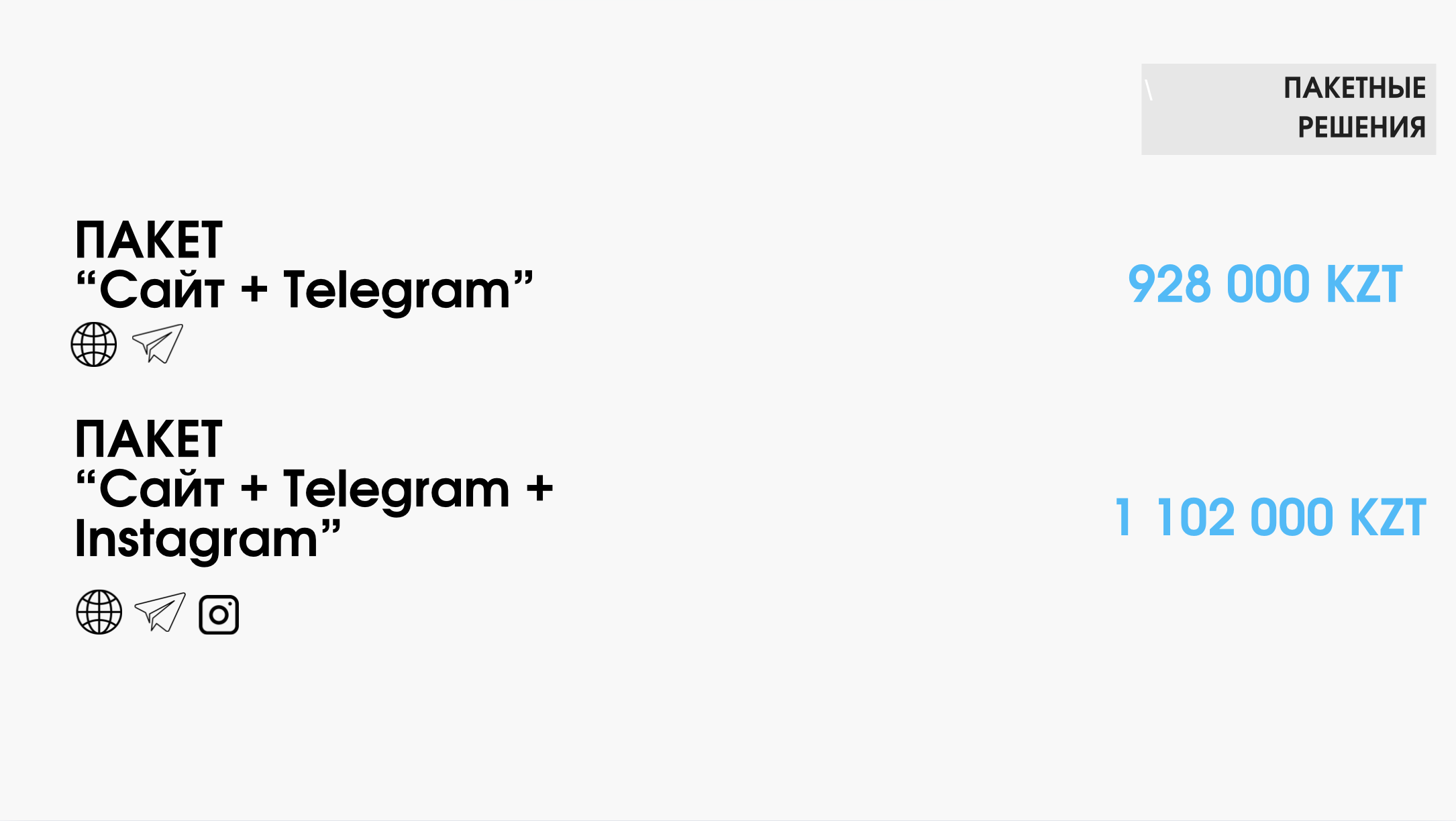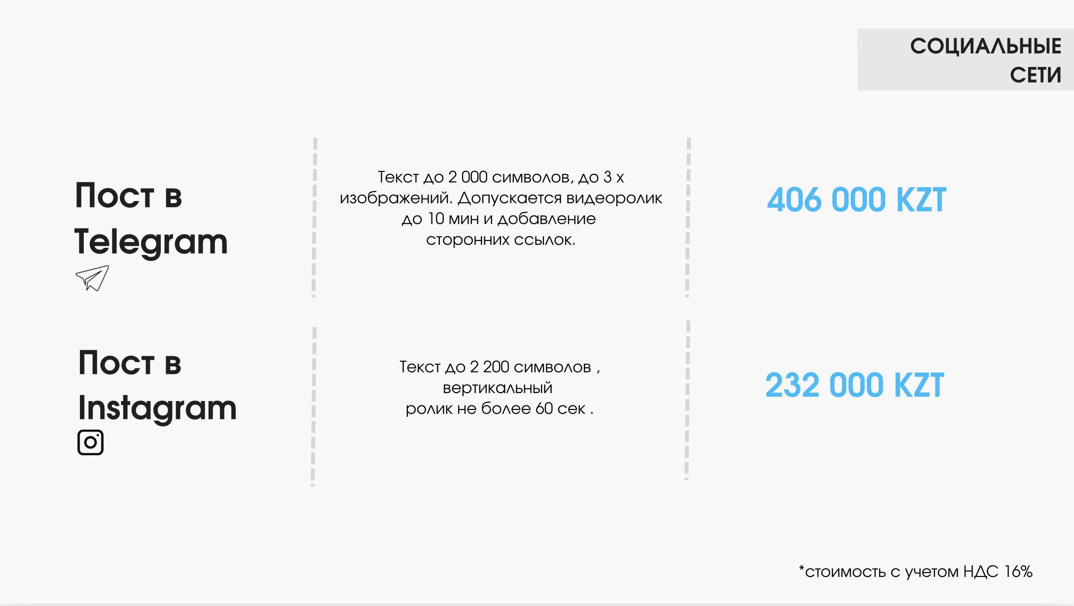 Все цены указаны в тенге (₸). Оплата возможна также в рублях (₽), долларах (USD) и евро (EUR). Конвертация производится по официальному курсу Национального банка РК на дату выставления счёта.